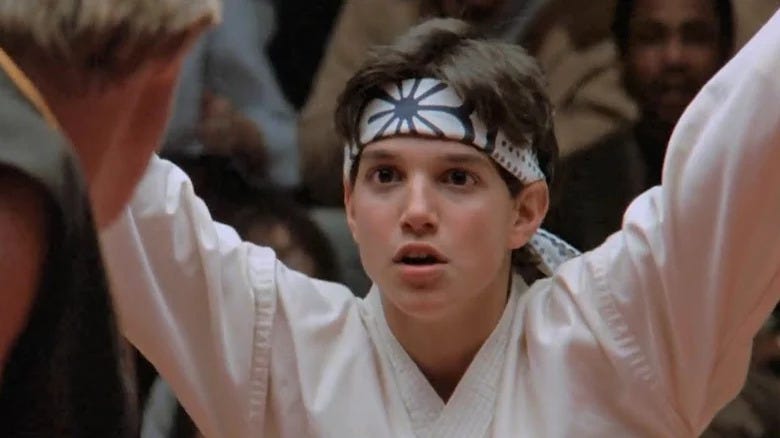 Daniel LaRusso from The Karate Kid? An awkward Jersey teen uprooted to California, bullied by rich kids, learning karate under Mr. Miyagi—every adolescent’s wish-fulfillment mirror, relatable in his clumsiness, crushes, and growth from zero to hero.