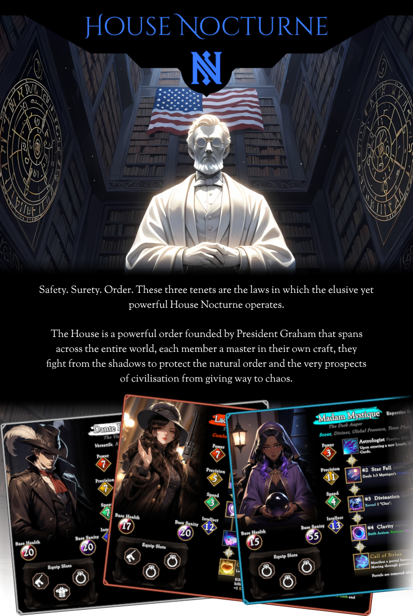 Heroes of Nocturne is a card-based tabletop RPG set within the world of Hotel Erebus, Stratum Press’s first novella. HoN is the first game produced and published by Stratum Press.
