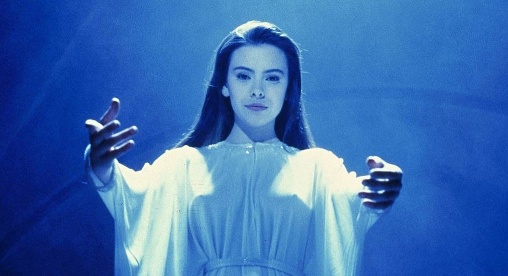 And in 1997’s The Fifth Element, a futuristic cabbie played by Bruce Willis protects a strange and beautiful young woman played by Milla Jovovich in her attempt to stop a cosmic force from destroying Earth. As it turns out, the Fifth Element is love and the brief expression of this force between Willis and Jovovich is what saves the day.